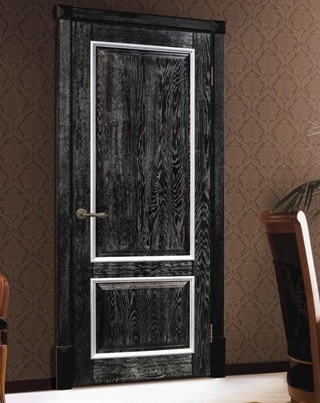 - из дуба. Данная порода любима многими дизайнерами и просто ценителями безупречного качества. Купить чёрную дверь из массива дуба можно в квартиру, офис, шикарный загородный дом. Выполненная из выдержанного и грамотного обработанного материала, она способна противостоять негативным климатическим воздействиям и серьёзным ударным нагрузкам. Визитной карточкой породы является её фирменный причудливый узор и хорошо различимые волокна. Морение придаёт древесине очень яркий угольный цвет, разбавленный серыми или коричневыми прожилками;
